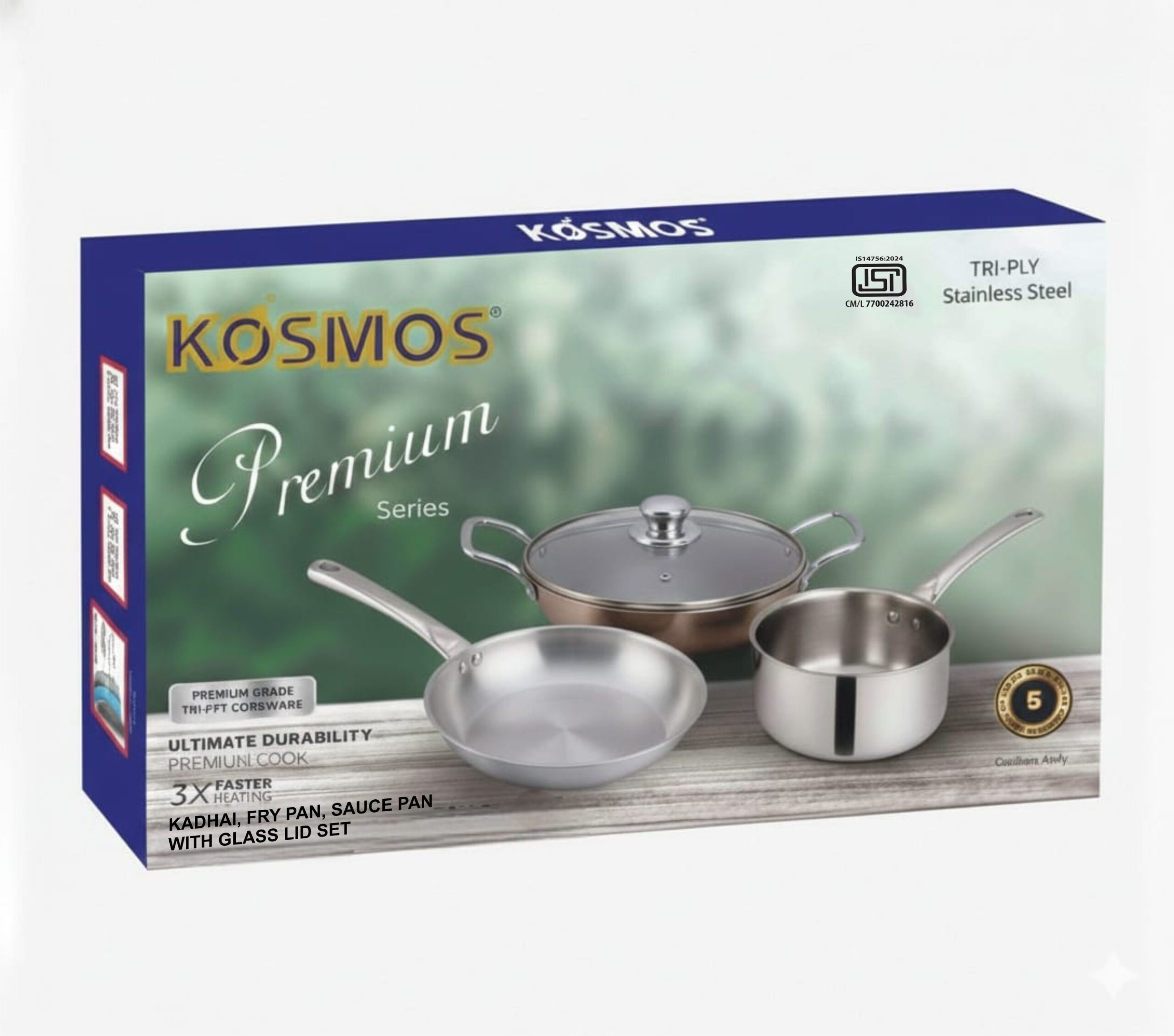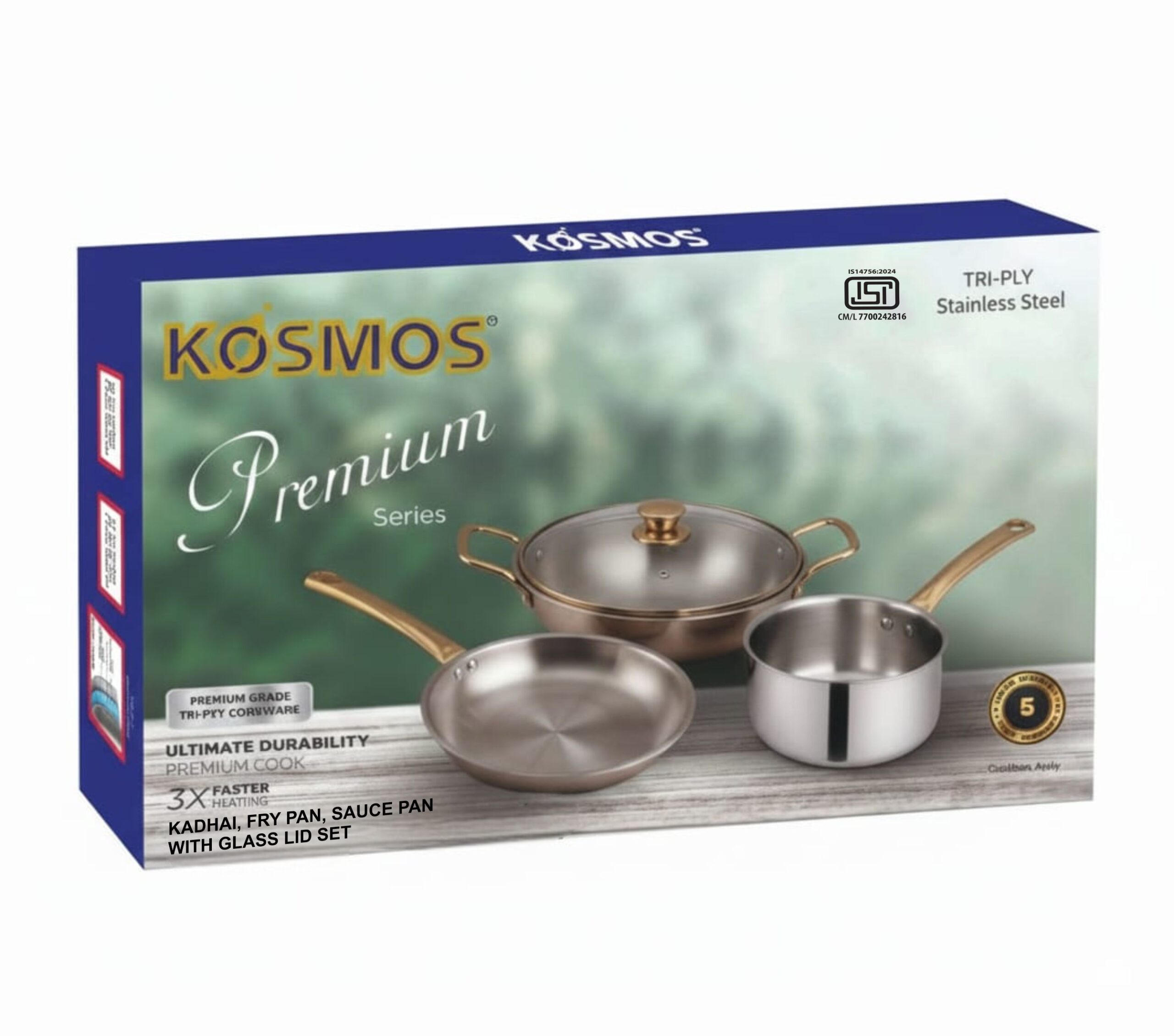 KOSMOS Premium Series Tri-Ply Kadhai & Fry Pan Set with Glass Lid