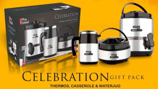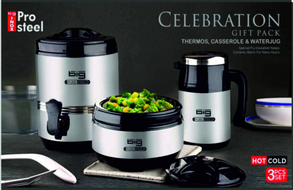 The Big Celebration Gift Set is a luxurious 3-piece thermoware collection, perfect for keeping your food and beverages warm or cold for hours. This set includes a high-quality stainless steel kettle, casserole, and water jug, designed for everyday use and special occasions. With thick P.U. insulation and a rust-free stainless steel finish, it combines functionality, durability, and elegance.