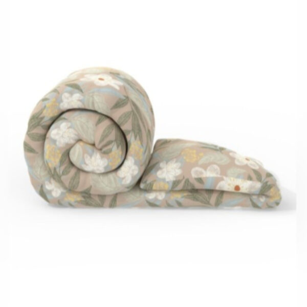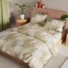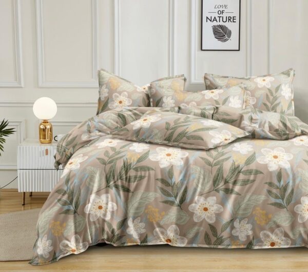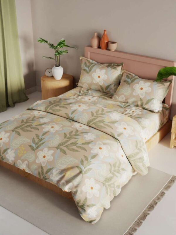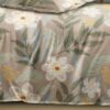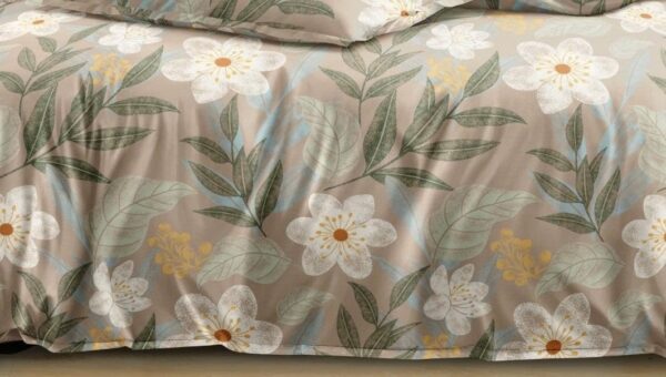 Transform your bedroom into a serene botanical sanctuary with this exquisite Sofia 5-piece Dohar bedding set. The elegant design features delicate white flowers with subtle orange centres, complemented by sage green leaves on a sophisticated beige background. This luxurious bedding ensemble includes perfectly coordinated pieces that create a harmonious look. The subtle colour palette and nature-inspired motif bring a touch of tranquility to your space, while seamlessly blending with various room décors. The floral pattern, reminiscent of a peaceful garden, is artfully arranged across the fabric to create a continuous, flowing design. Each piece in this set is thoughtfully crafted to ensure both visual appeal and comfort. The set makes a wonderful addition to any bedroom, whether you’re refreshing your own space or searching for a tasteful gift. Perfect for year-round use, this bedding set adds a sophisticated touch while creating an inviting atmosphere in your bedroom.