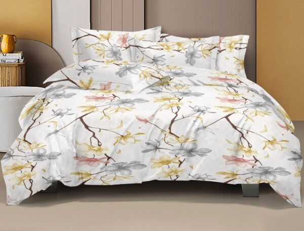 Transform your bedroom into a serene sanctuary with this exquisite double bed sheet set from Spectrum. The pristine white background serves as a perfect canvas for the enchanting floral pattern featuring metallic gold, silver, and pink blooms interconnected by delicate brown branches. This sophisticated design adds a touch of understated luxury to your sleeping space while maintaining a contemporary aesthetic. The bedding set includes coordinated pieces that create a cohesive look for your bedroom décor. The pattern’s metallic elements catch and reflect light beautifully, adding dimension and visual interest to your bed ensemble. Perfect for modern homes, this bedding set combines style with functionality, making it an ideal choice for master bedrooms or guest rooms. The balanced colour palette ensures it complements a variety of interior design schemes, from minimalist to classic. Elevate your bedroom’s ambiance with this stunning floral bed linen set that marries elegance with modern design sensibilities.