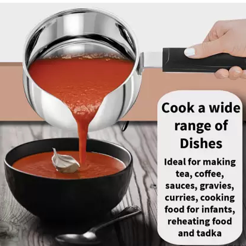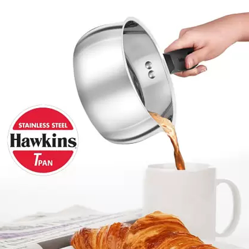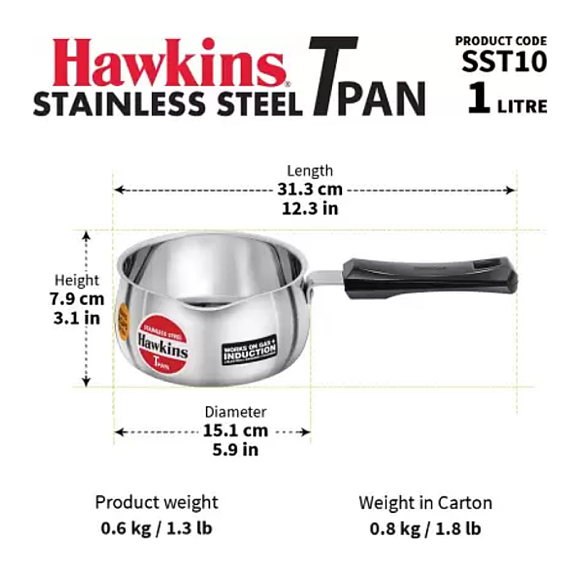 Superior, rust proof, food grade Stainless Steel for healthy and hygienic cooking. The 4.7 mm extra thick sandwich bottom stays flat, heats evenly and will not develop hotspots. The AISI 430 grade magnetic stainless steel base plate that makes the pan work well on both Gas and Induction. It has a strong, stay cool plastic handle fixed on sturdy stainless steel bracket which is permanently riveted to the Pan. Suitable for use on domestic gas, induction, electric, ceramic and halogen stoves. Perfect for making tea, coffee, soups, sauces, chutneys, gravies, curries, Rice, Pilau, Dal; Boiling noodles, pasta, eggs, Cooking food for infants; Reheating food and for tadka. The Hawkins Stainless Steel TPan is ideal for making tea and coffee. It is also ideal for making soup, boiling milk and water, cooking instant noodles and re heating food. The 4.7 mm extra-thick sandwich bottom stays flat, heats evenly and will not develop hotspots. The TPan body is made from superior food grade AISI 304 non magnetic stainless steel. The AISI 430 magnetic stainless steel base makes the TPan Induction Compatible. It has a technologically advanced, specially designed Ezee Pour spout for easy, no drip pouring. The strong, sturdy, stay cool handle is firmly attached with two stainless steel rivets. A maximum fill level is marked on the inside wall for greater convenience. The TPan is suitable for all domestic gas, electric, halogen, ceramic and induction cooktops.
