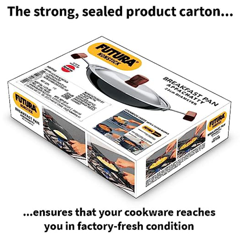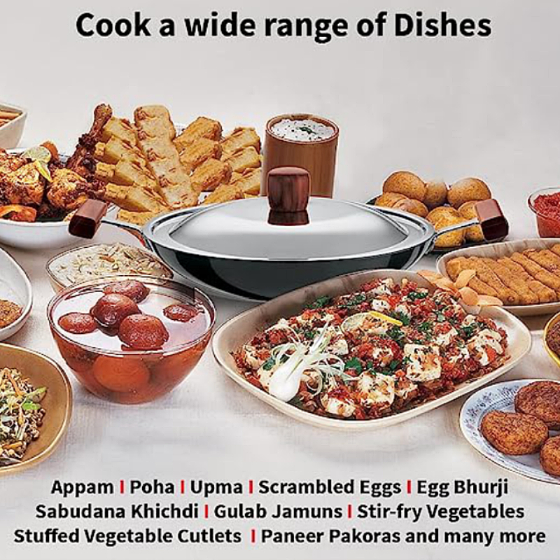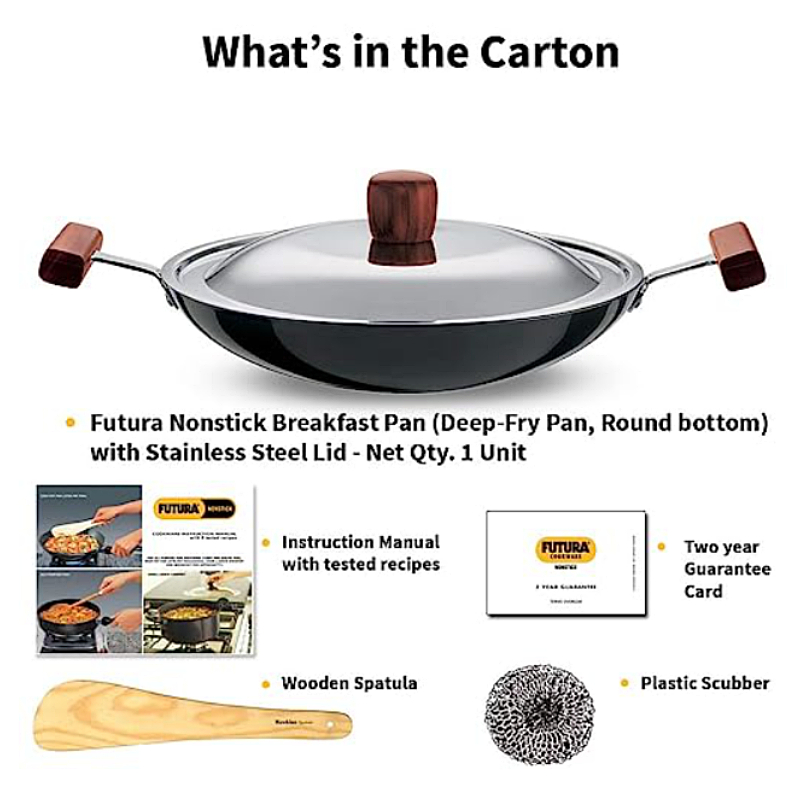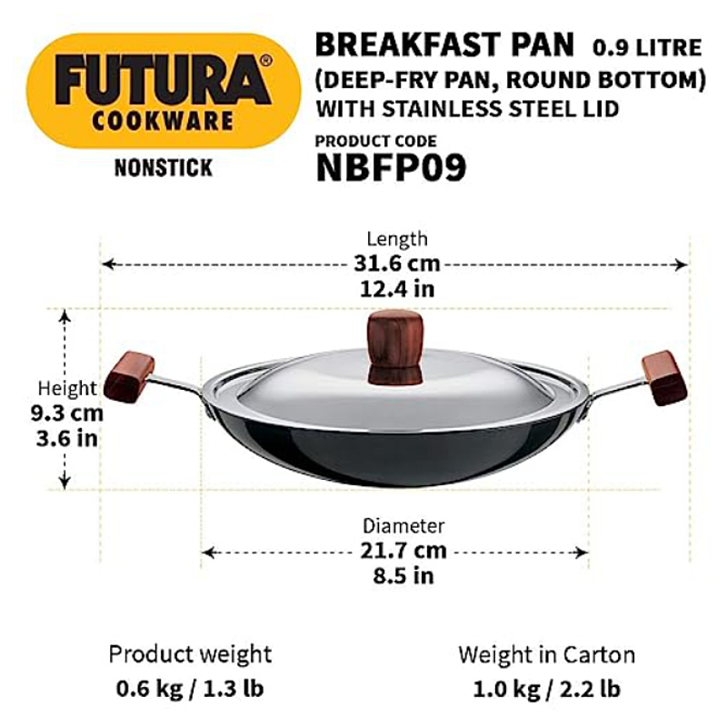 Futura Nonstick Breakfast Pans are distinguished by elegant, comfortable rosewood handles fixed on sturdy stainless steel brackets which are permanently riveted to the pans. The handles are carefully designed to provide greater comfort and safety, particularly when handling hot foods. The cooking surface is made of PFOA free with a unique patented process by which high quality nonstick coating (made in Germany) is locked firmly into the tough Hard Anodised surface underneath. Therefore, the nonstick, if used properly, would last longer than the ordinary nonstick. The pans have curved sides suitable for deep frying and stir frying. The pans are offered with a Round Bottom for greater convenience during stir frying and ideal for use on domestic gas stoves or radiant electric cooktops. The Lid is made of AISI 304, 18/8 food grade Stainless Steel that is extremely hygienic, durable and non reactive to most foods. It has a comfortable, stay cool Rosewood knob. Perfect for Appam (Rice and Coconut Milk Pancakes), Firni (Milk and Ground Rice Pudding), Bengal Fish Curry, Stir Fried Bean Sprouts and Vegetables, Samosa (Savoury Stuffed Pastries, Egg Curry and Kadai Masala Chicken (Spicy Stir Fried Chicken)