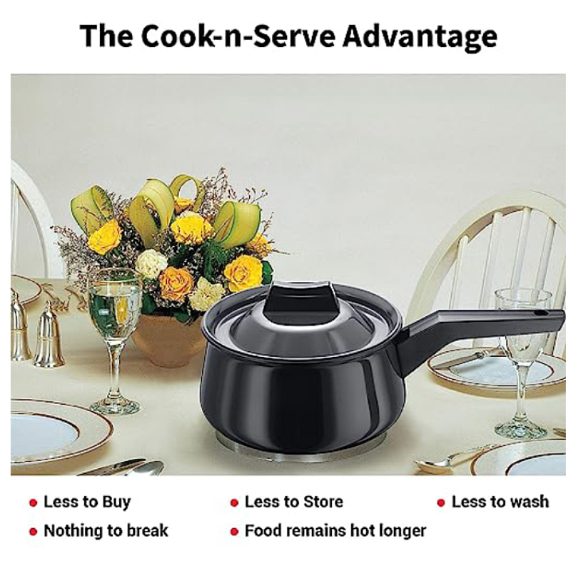 It is a modern version of the traditional Indian cooking utensil that requires minimum water for cooking. Water poured into the specially designed moat on the lid condenses the steam that rises from the food simmering in the Handi, which forms droplets on the underside, making delicious, tender, flavourful and moist food