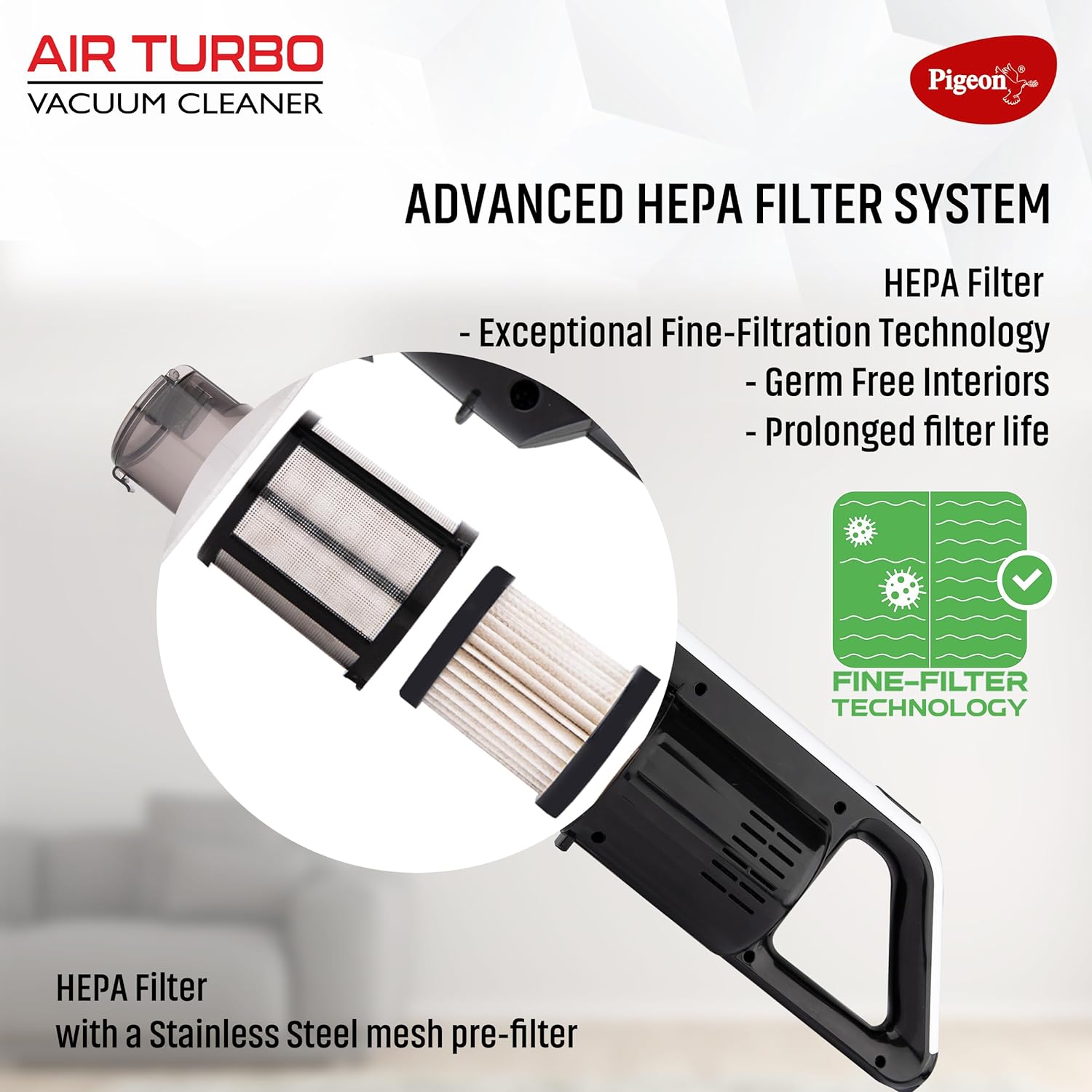 Keep your home spotless with the Pigeon Air Turbo Vacuum Cleaner, designed for powerful suction, quiet operation, and maximum convenience. With its 18 KPA high suction power, it effortlessly lifts dirt, dust, and debris from carpets, sofas, corners, and hard-to-reach areas.