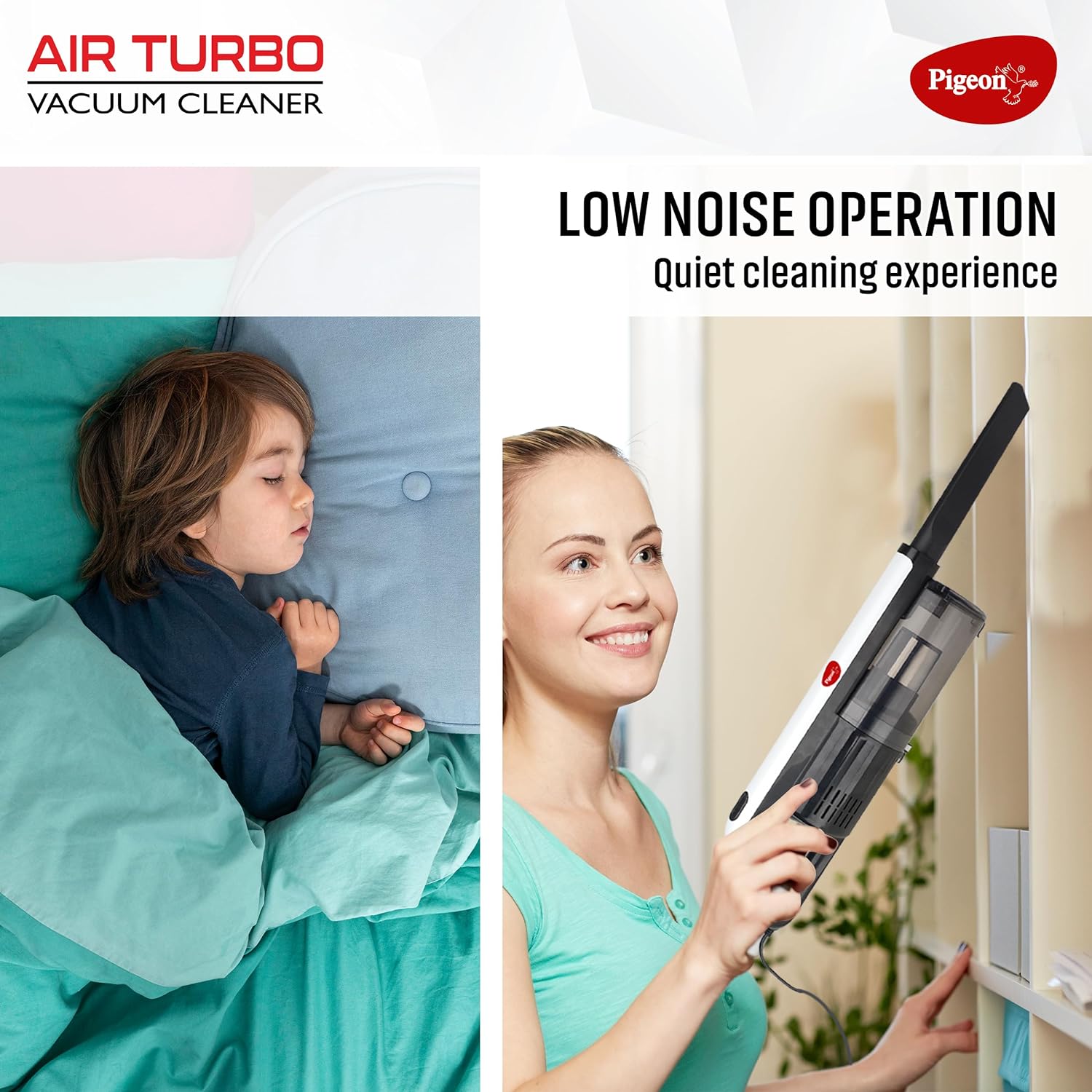 The Pigeon Air Turbo comes with versatile accessories, including a round brush for carpets, mats, and sofas, and a crevice nozzle for corners, vents, and windows, making it perfect for all cleaning needs. Despite its powerful performance, it offers low noise operation for a peaceful cleaning experience.