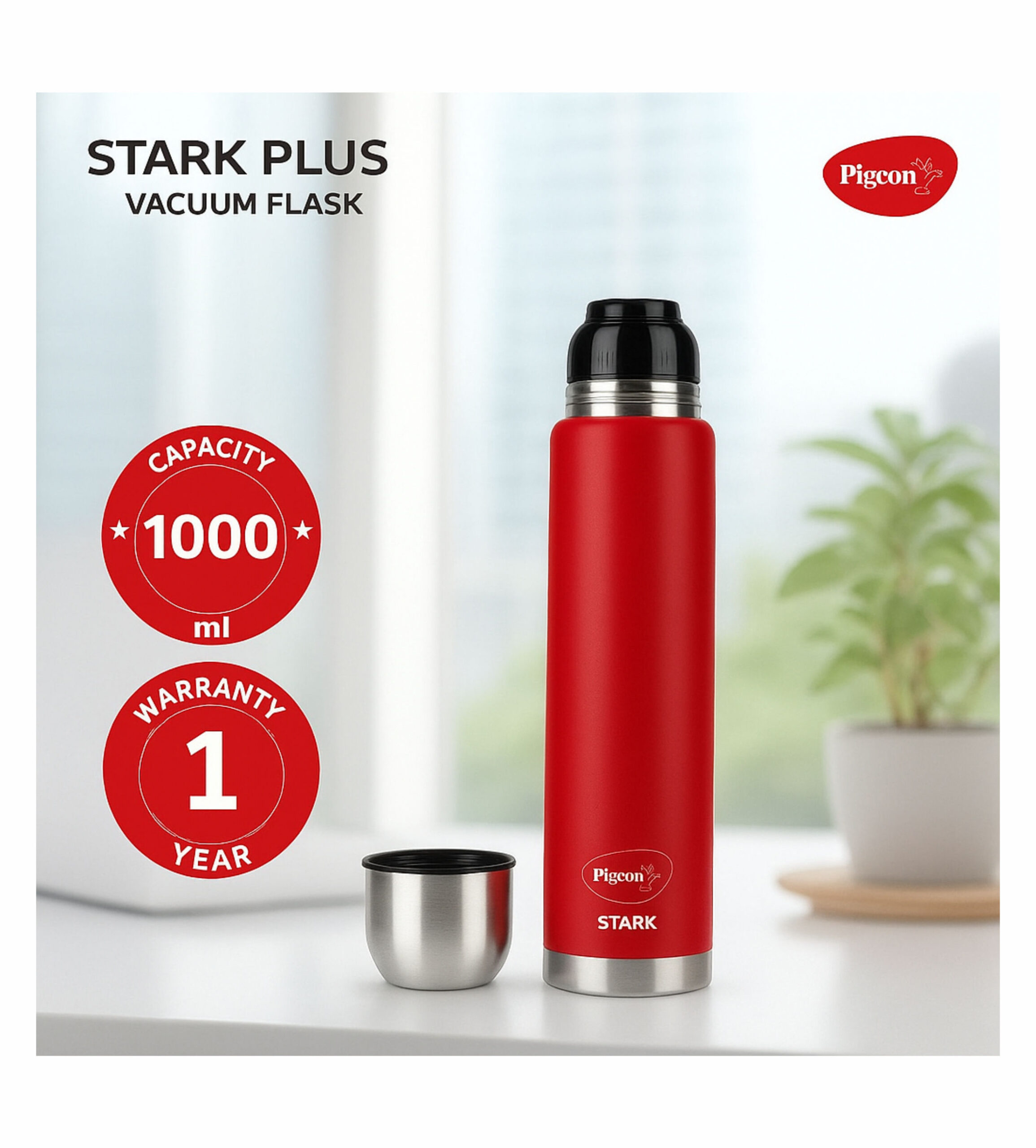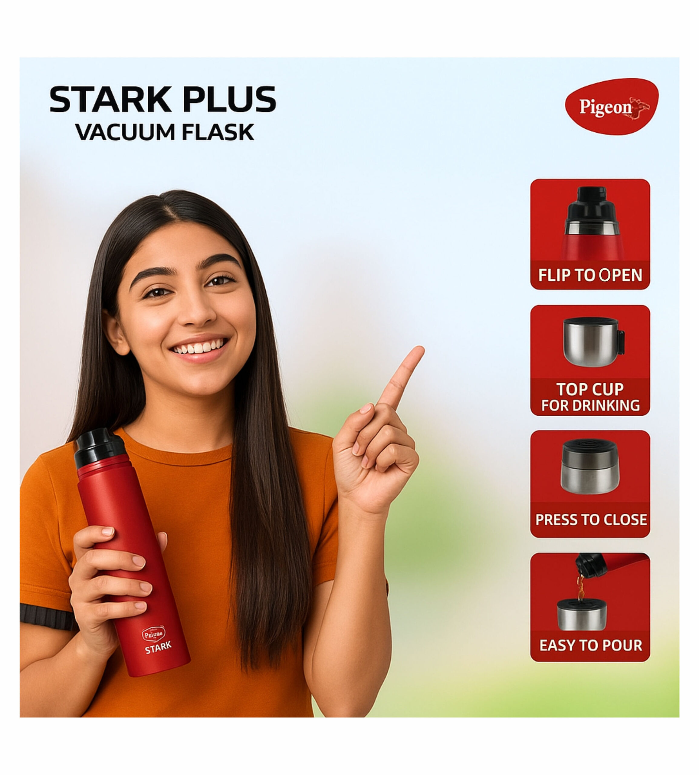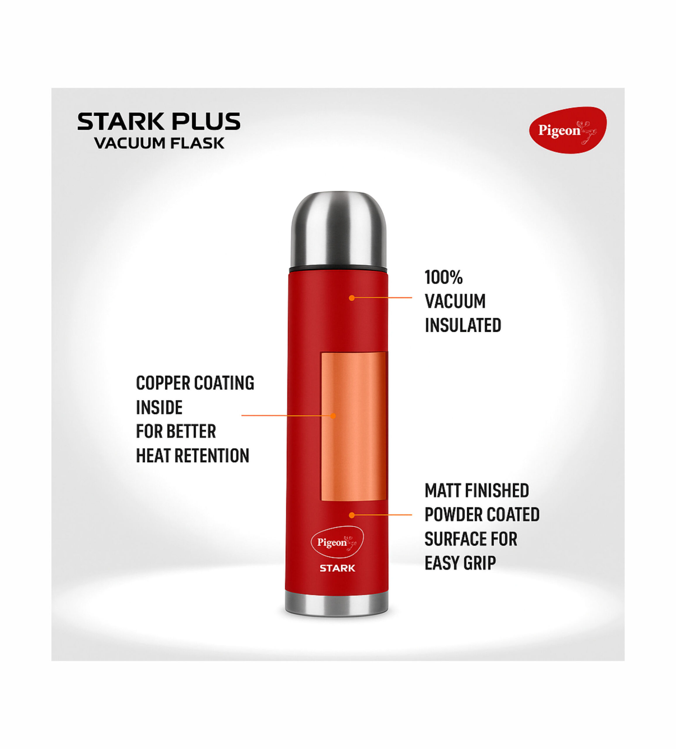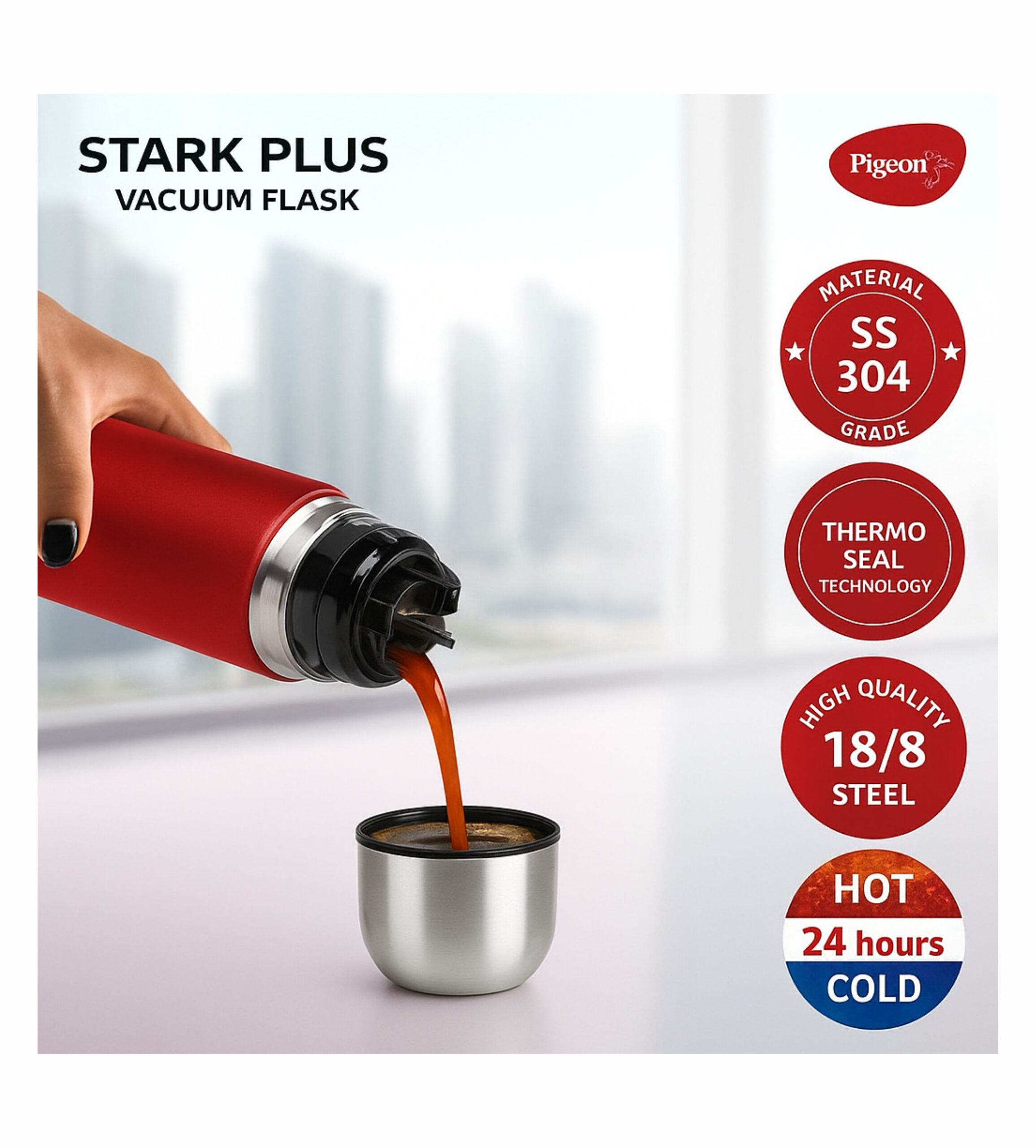 Keep your beverages hot or cold for hours with the Pigeon Stark Plus Vacuum Flask. Designed with premium SS 304 grade stainless steel and copper coating inside, this stylish red flask ensures superior heat retention and durability. Perfect for home, office, travel, or outdoor use.